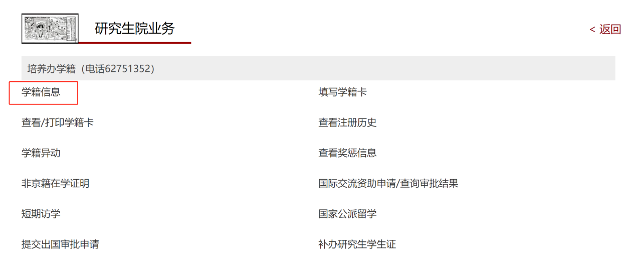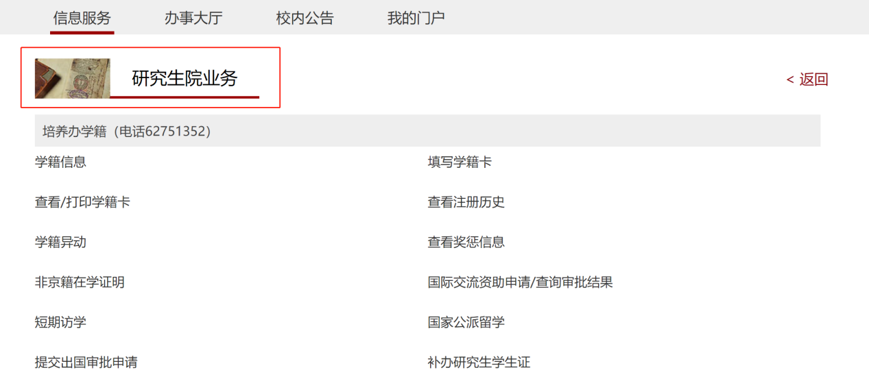 研究生复核信息的具体路径为:登陆“校内门户”→点击“信息服务”→在搜索框搜索“研究生院业务”→点击“研究生院业务”→在“培养办学籍”栏目中找到“学籍信息”,点击进入→在上方栏目中选择“信息修改”,核对姓名拼音信息。信息核对无误后,点击页面下方“保存”按钮即可。
